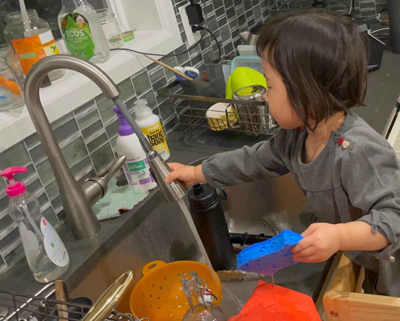 My daughter at 2.5 years old. She has been eagerly helping with the dishes since she was two. Of course, whenever she helped, the floor and the area around the sink would turn into a bit of a water park, adding to my workload. But the fact that she wanted to join in and help mom and dad was so heartwarming and sweet that I always made sure to thank her and tell her how much I enjoyed doing chores together. Perhaps because of that, my now five-year-old daughter loves to help out around the house. She considers matching socks and folding towels her jobs, often wipes down the table, helps with the dishes, and even pre-washes her dirty clothes before putting them in the washing machine.