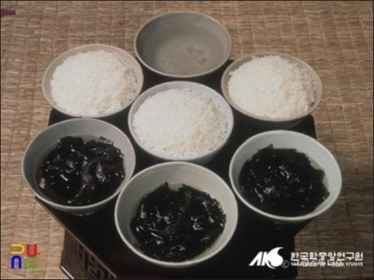 The food offered to the goddess became the mother’s first meal after delivery — a dish called cheotkukbap (첫국밥), literally “first soup and rice.” This was not ordinary nourishment. It was the household’s way of saying: you have done something sacred, and we are feeding you with sacred food.